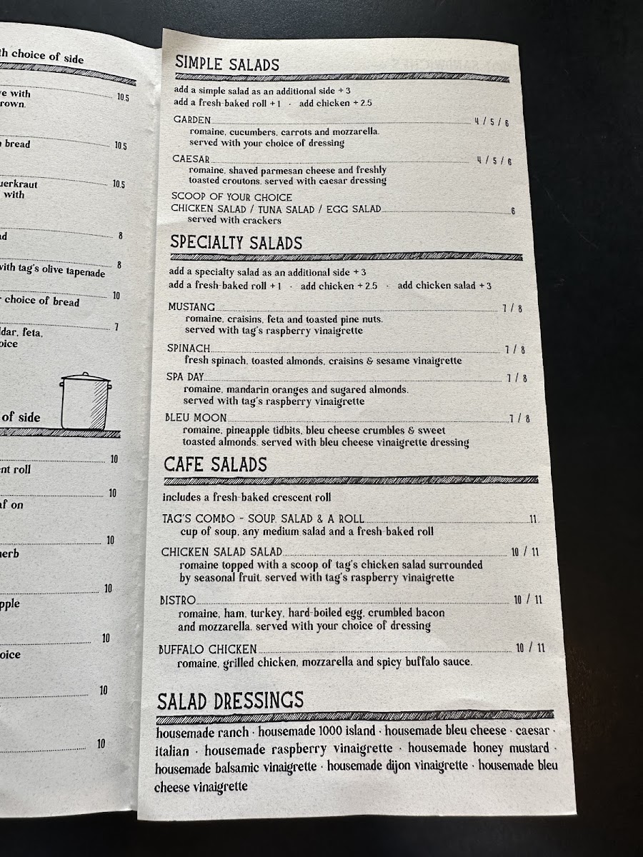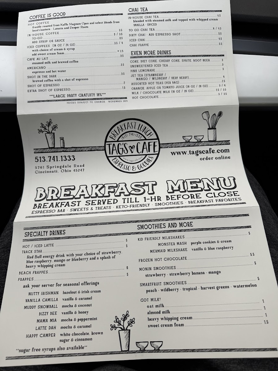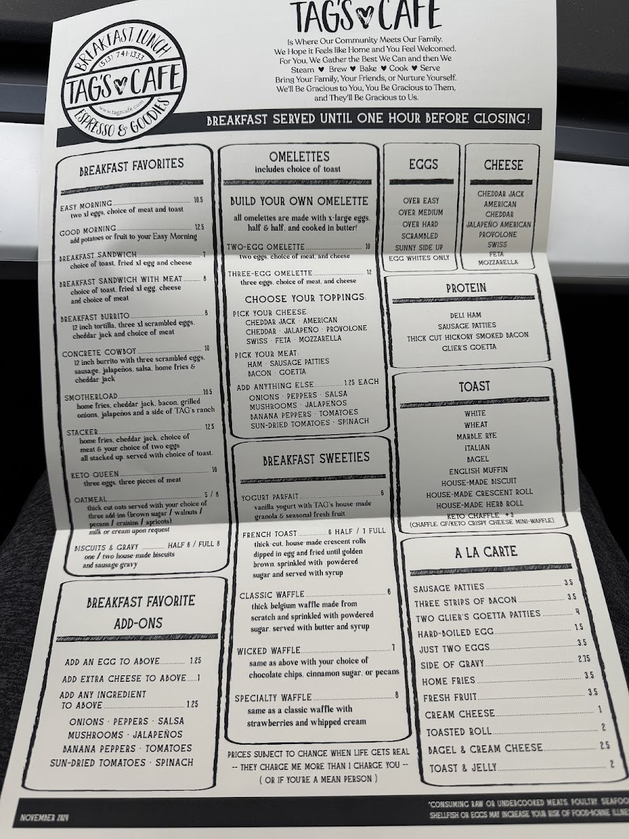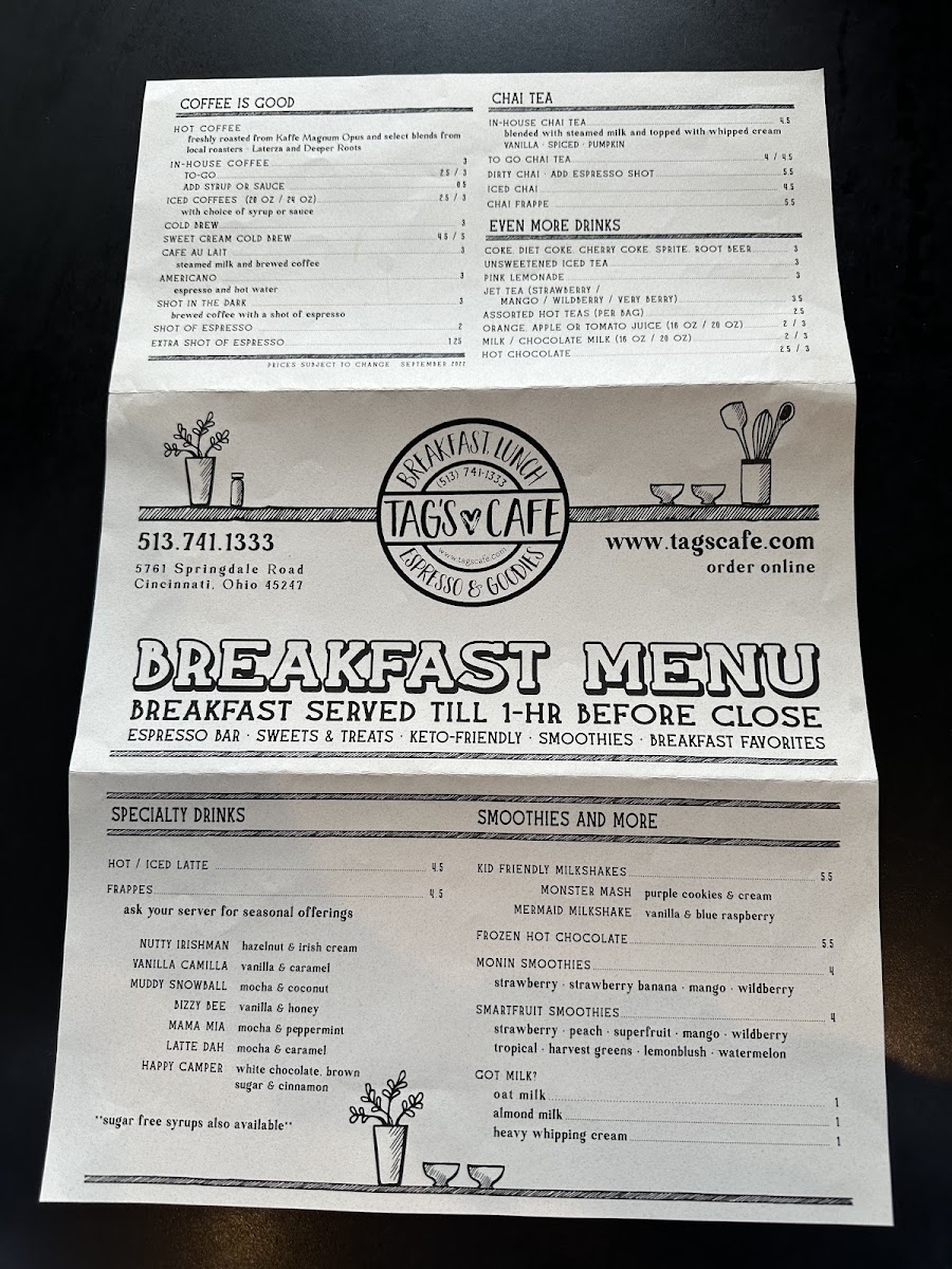 Introducing the menu of Tags Cafe & Catering LLC, a delightful culinary gem nestled in Cincinnati. This charming cafe is celebrated for its homemade comfort food, which has garnered rave reviews from satisfied customers. Each dish reflects a passion for quality and flavor, from the soft, fresh-made rolls in their breakfast sandwiches to the exquisite French toast that leaves diners craving more. The cozy atmosphere enhances the experience, making it a perfect spot for a quick breakfast or a leisurely lunch.